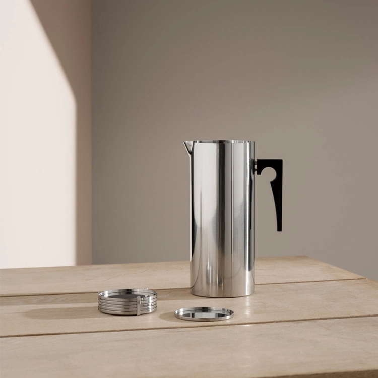 Arne Jacobsen의 아이스 립이 달린 주전자 디자인은 일상 생활과 특별한 경우에 실용적입니다. 스테인리스 스틸로 만든 주전자는 2L의 물을 담을 수 있으며,