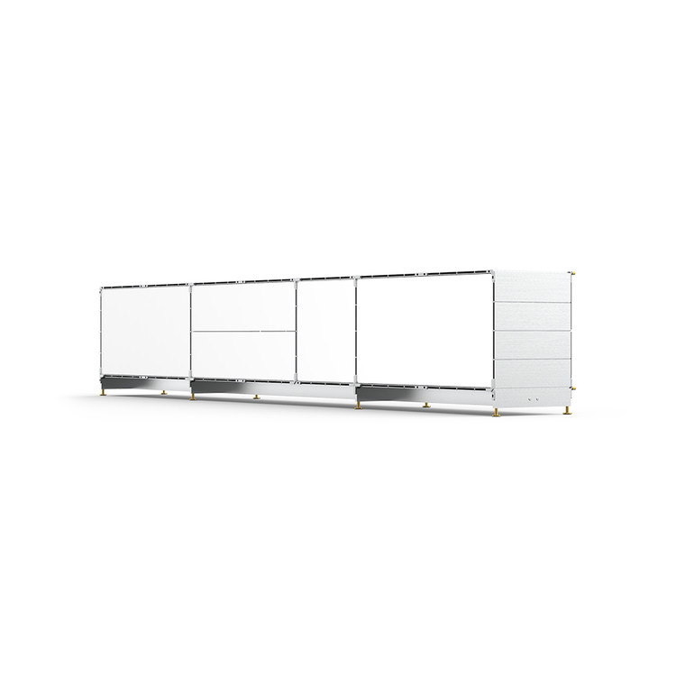 제품 외관은 알루미늄 압출성형으로 제작되어 심미성과 내구성을 모두 겸비하였습니다. 인터넷 공유기, 셋탑박스, CD 등을 보관하기 용이한 구조이며 오동나무 판재 및 Melatone Clean Touch HPL 재질로 구성된 서랍은 blum runner system과 결합되어 원터치 슬라이딩으로 방식으로 동작됩니다.