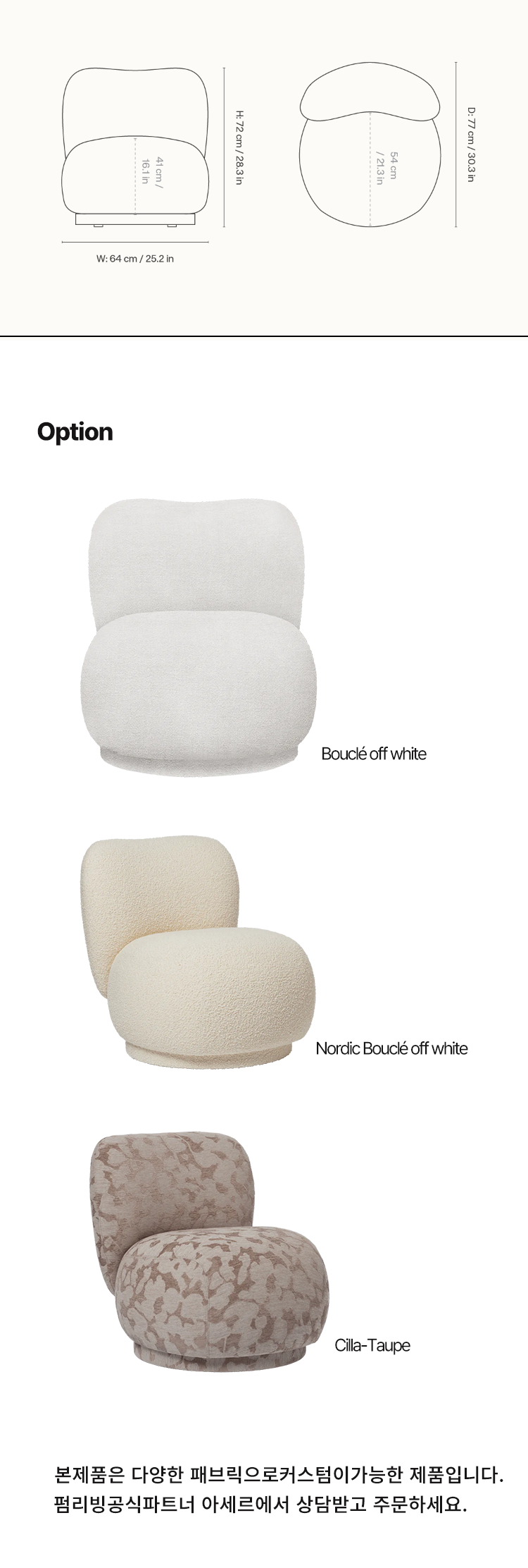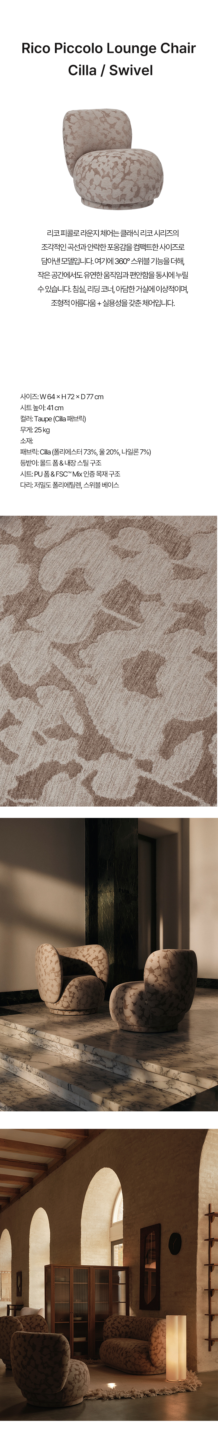 특징: 컴팩트 라운지체어 / 360° 회전 가능 / Made to Order 맞춤 제작