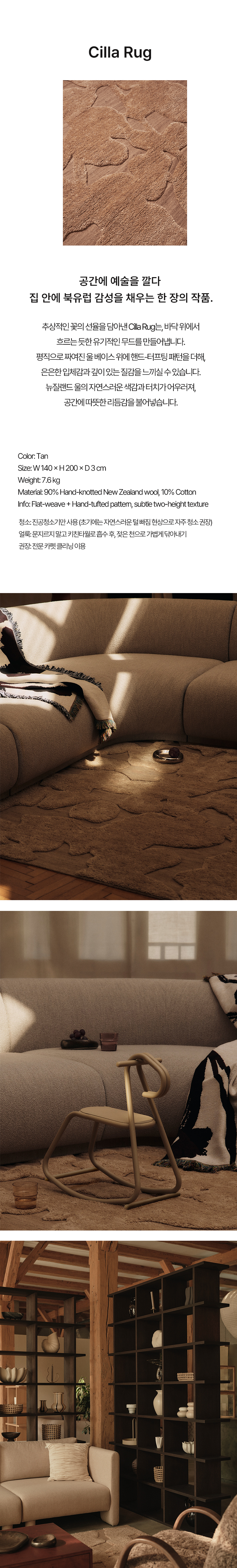 Cilla Rug는 북유럽 감성을 담은 핸드메이드 울 러그로, 추상적인 플로럴 패턴과 평직·터프팅이 어우러진 입체감이 특징입니다. 뉴질랜드산 울을 사용해 내구성과 따뜻한 질감을 동시에 갖추었으며, 거실 러그나 침실 인테리어 러그로 이상적입니다. 공간에 포인트를 주고 싶은 분들에게 추천하는 프리미엄 디자인 러그입니다.