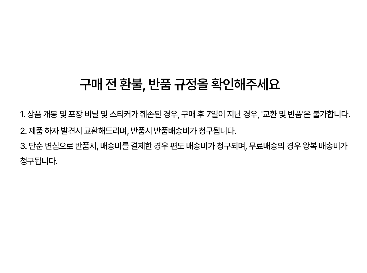 고객의 단순 변심이나 주문실수로 인한 반품, 교환(사이즈 및 색상등) 의 경우 왕복 배송비는 구매자가 부담합니다.