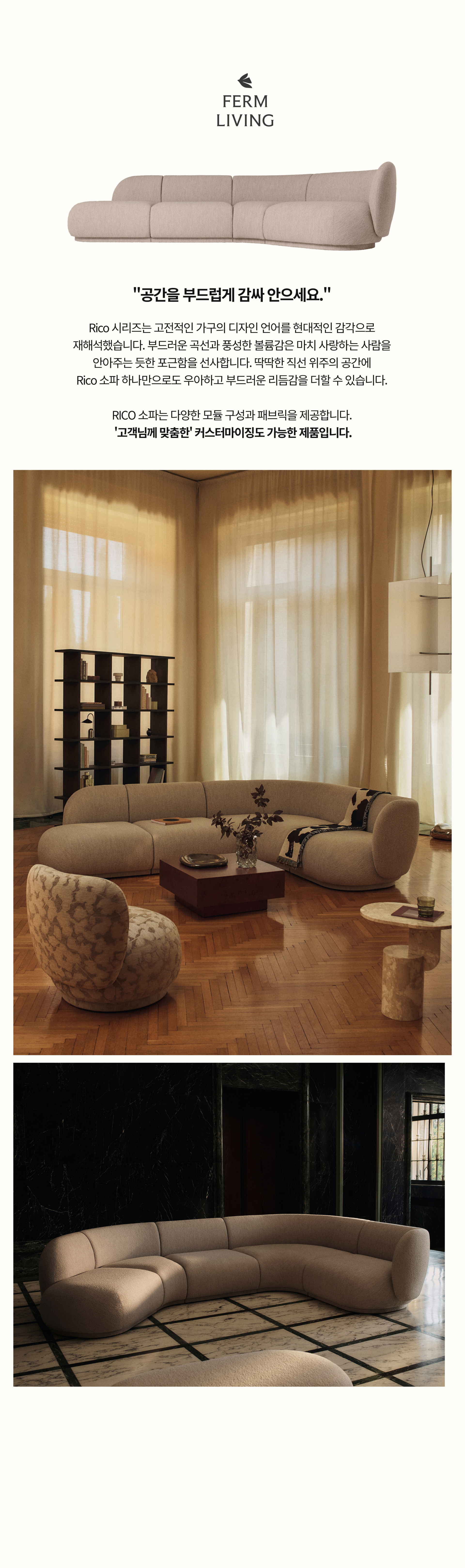 펌 리빙(Ferm Living) 리코 소파(Rico Sofa). 우아한 곡선 디자인과 풍성한 볼륨감이 돋보이는 북유럽 프리미엄 가구입니다. 부클레 및 다양한 패브릭 커스터마이징으로 거실 인테리어의 품격을 높여보세요.