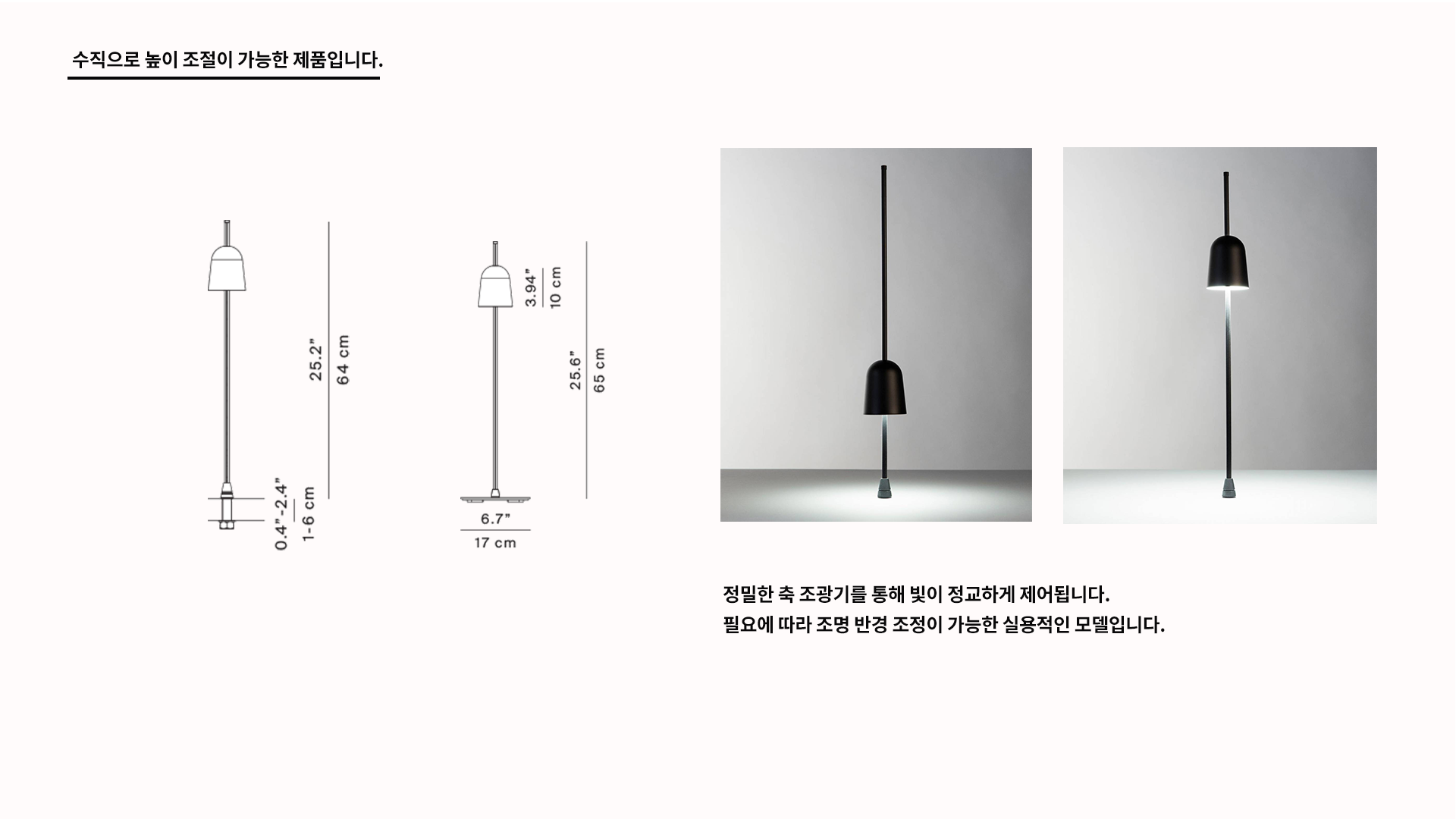 정밀한 축 조광기를 통해 제어되는 무한 음영의 가능성! 수직 이동에 따라 반응하는 마이크로프로세서를 통해 빛이 조정되기에 필요에 따라 조명 반경을 조절할 수 있습니다.