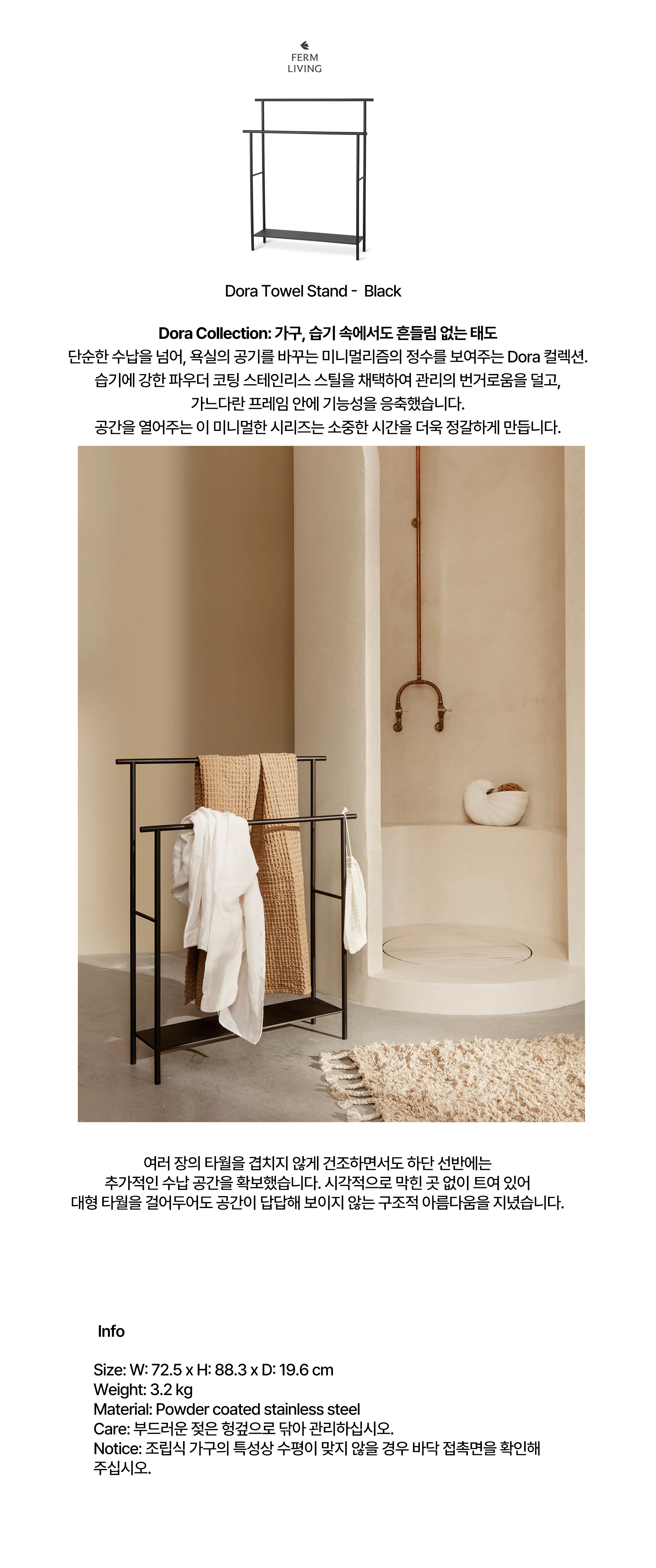 Dora Towel Stand는 여러 장의 타월을 동시에 걸 수 있도록 해주며, 하단에는 추가 수납 공간도 제공합니다.