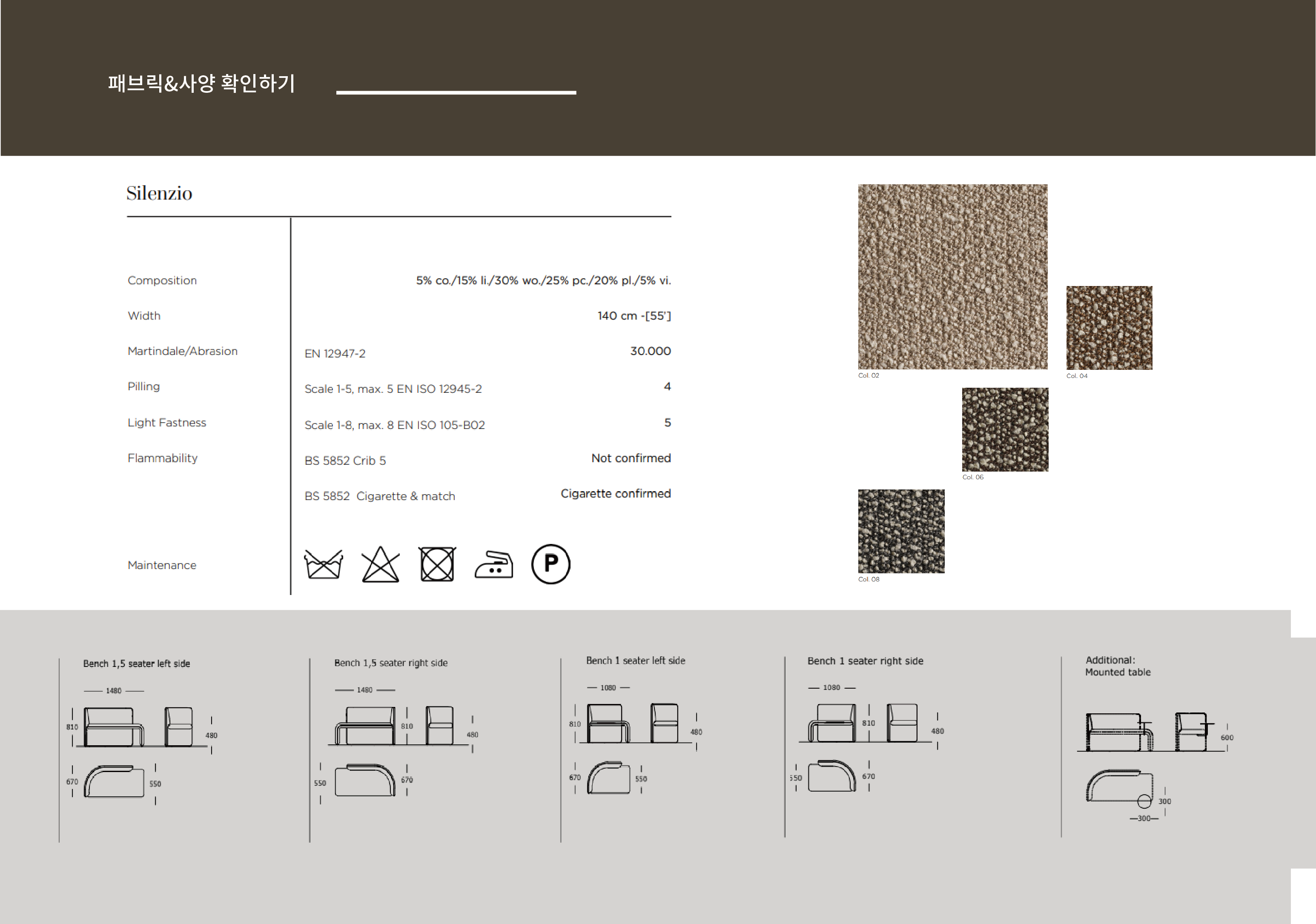 1seater, 1.5seater, 테이블이 함께 있는 Mounted Table 옵션 구성으로 되어있으며, 추가적으로 섬세한 배려를 통해 탄생한 좌우 방향 선택 옵션도 가능합니다. 카페, 라운지에서 선호도가 높은 소파입니다.
