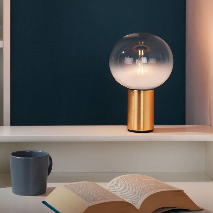 베이스가 돌출된 구형 테이블 램프로 테이블 상판에 부드럽게 확산되는 빛을 제공하고