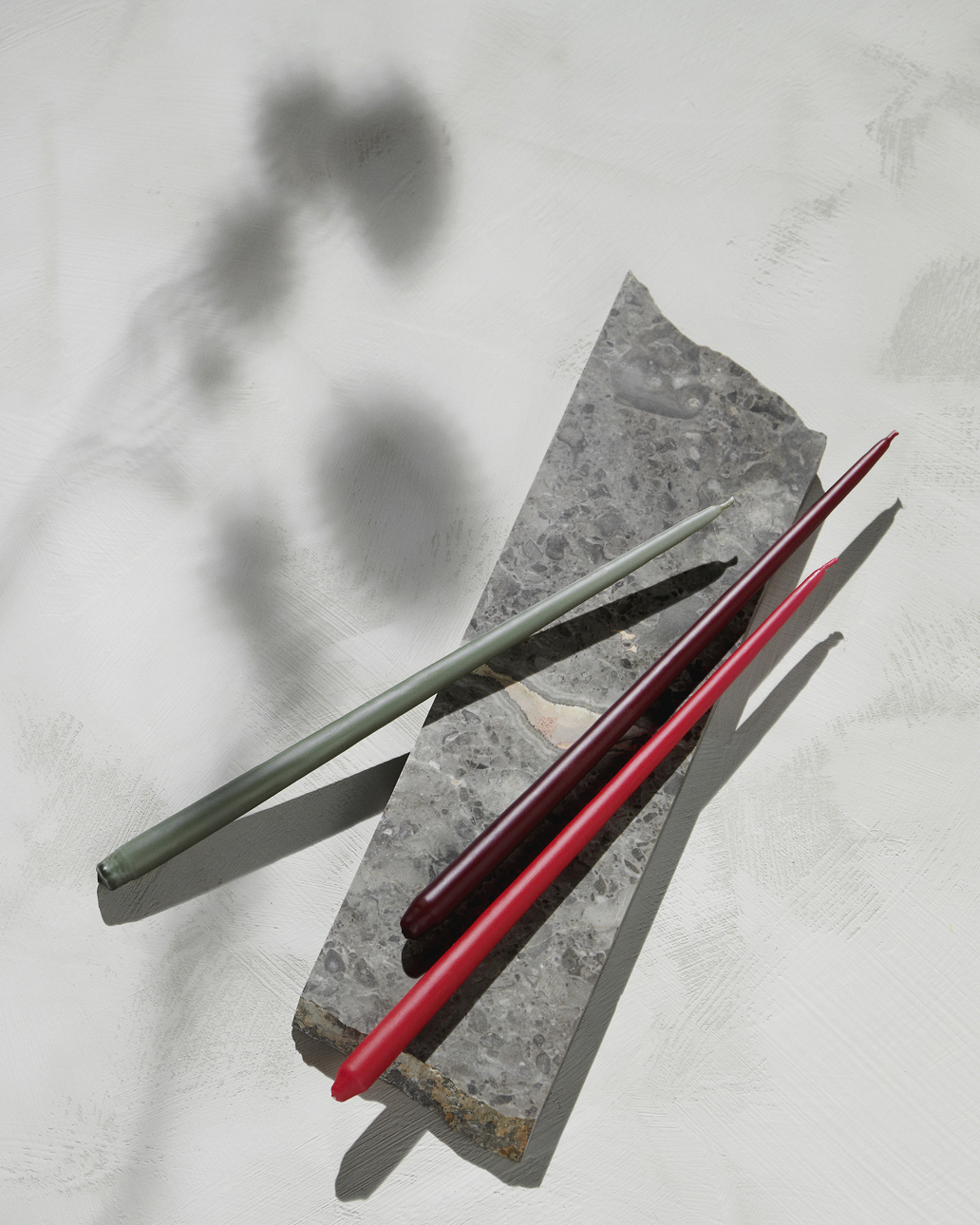덴마크산 ester & erik이 직접 손으로 염색한 STOFF Nagel 테이퍼 양초는 길고 가늘어지는 모양과 원뿔 모양의 바닥으로 STOFF Nagel 캔들 홀더에 완벽하게 들어맞습니다.