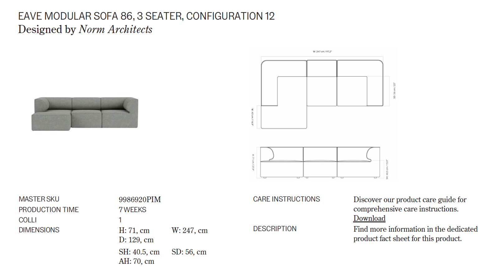 [오도 코펜하겐] Eave 이브 모듈러 소파 86, 3 Seater, Configuration 11-12