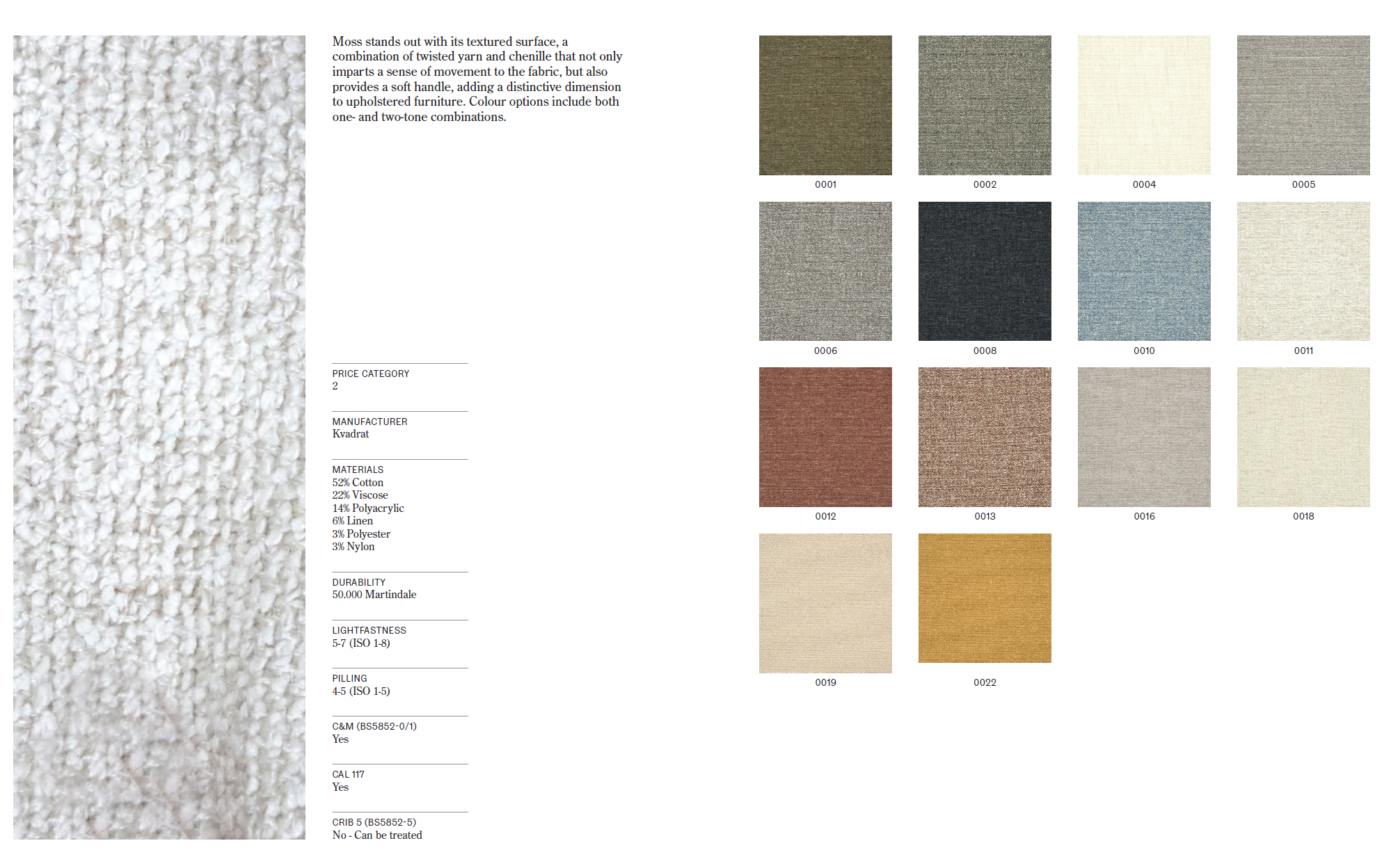 Option ④ Moss 모스: 직물의 꼬임을 통해 촉감과 시각적으로 율동성을 부여하는 모스 패브릭은 미세한 믹스 톤 매치를 통해 완성된 멋스러운 패브릭입니다.