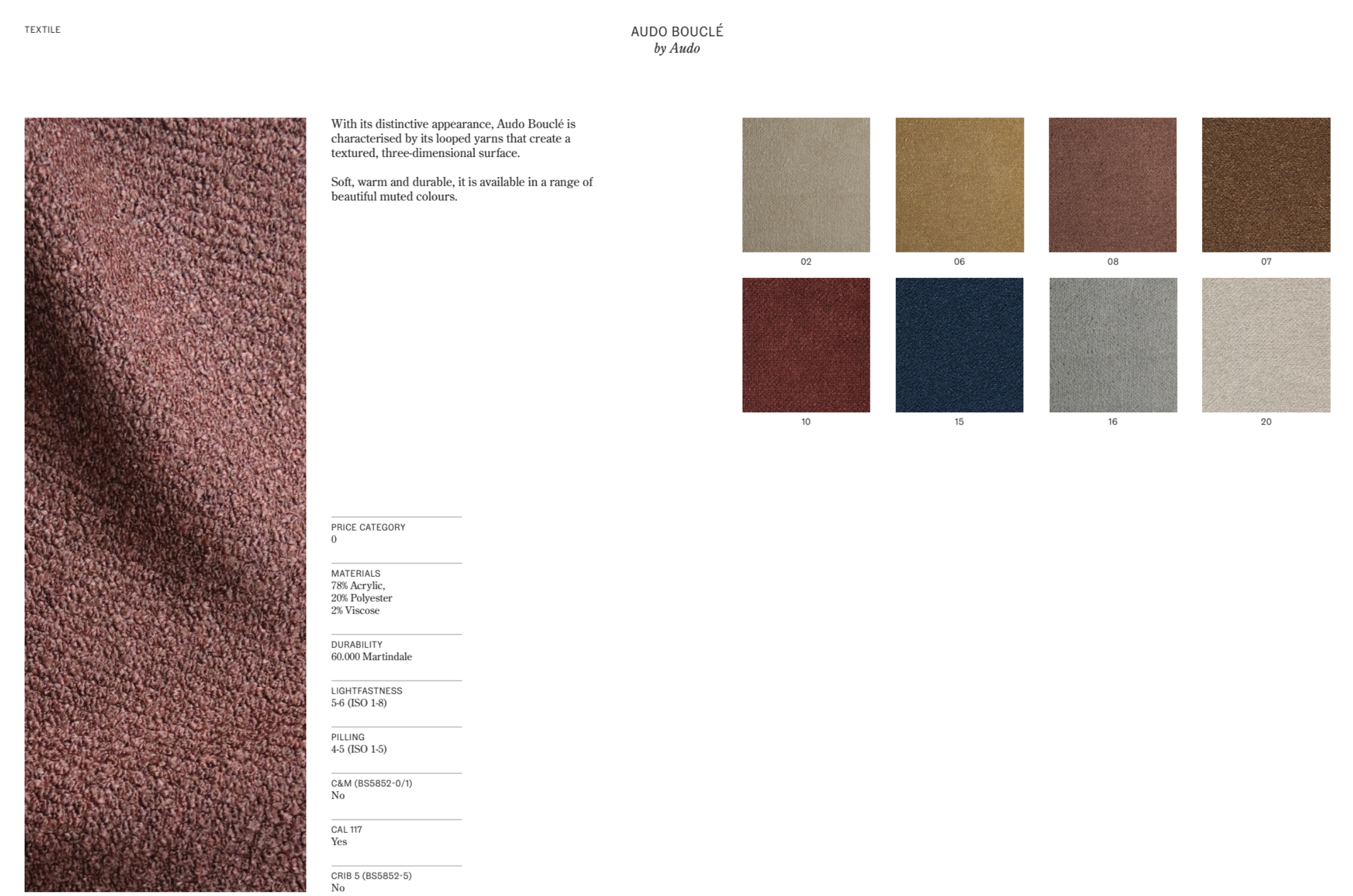 Option ① Audo Boucle 오도부클 : 한층 다운된 세련된 컬러 팔레트를 가진 오도만의 패브릭입니다. 부드럽고 따뜻하고 내구성이 좋은 원단입니다.