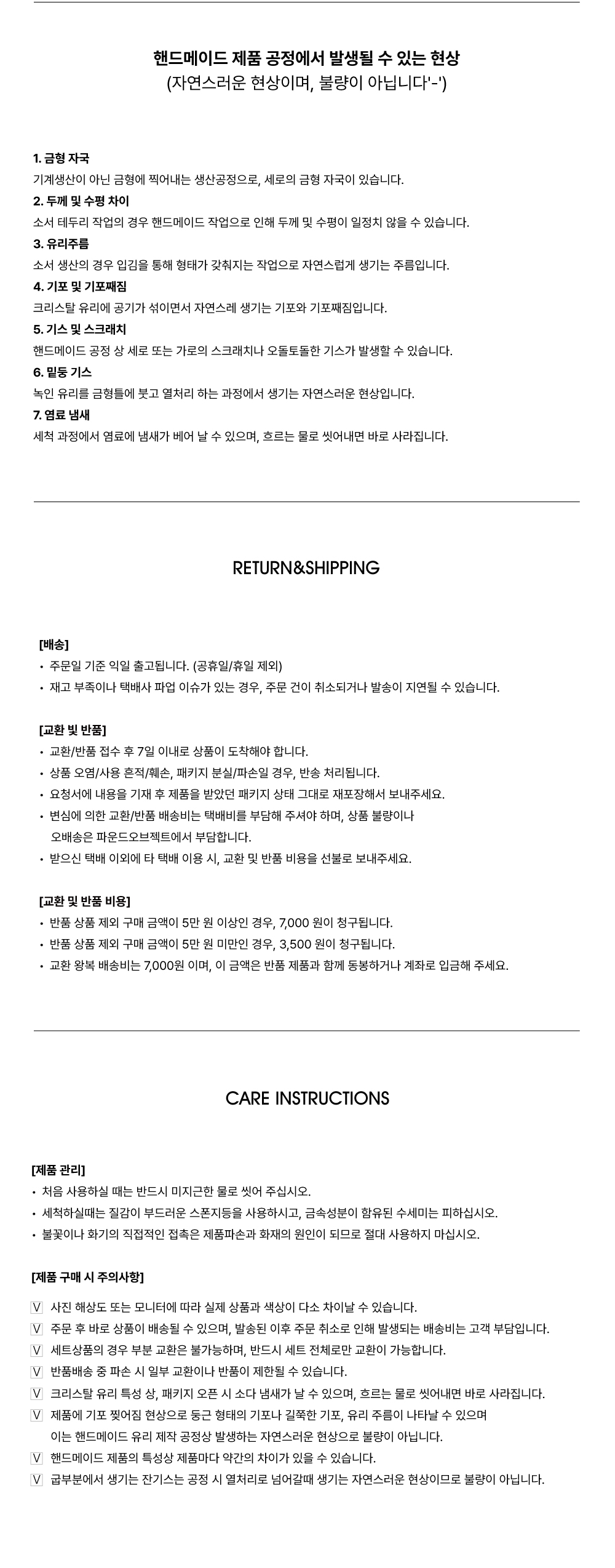 제품 특성과 생산 공정에서 위와 같은 특징이 발견 될 수 있으며, 이는 교환이나 반품 사유에 해당 되지 않는 점 안내드립니다.