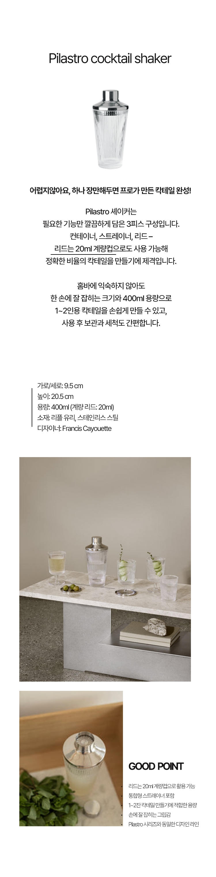 전통적인 맨해튼 칵테일 셰이커를 기반으로 디자인된 Pilastro 쉐이커는 용기, 필터, 뚜껑 세 부분으로 구성되어 있습니다.