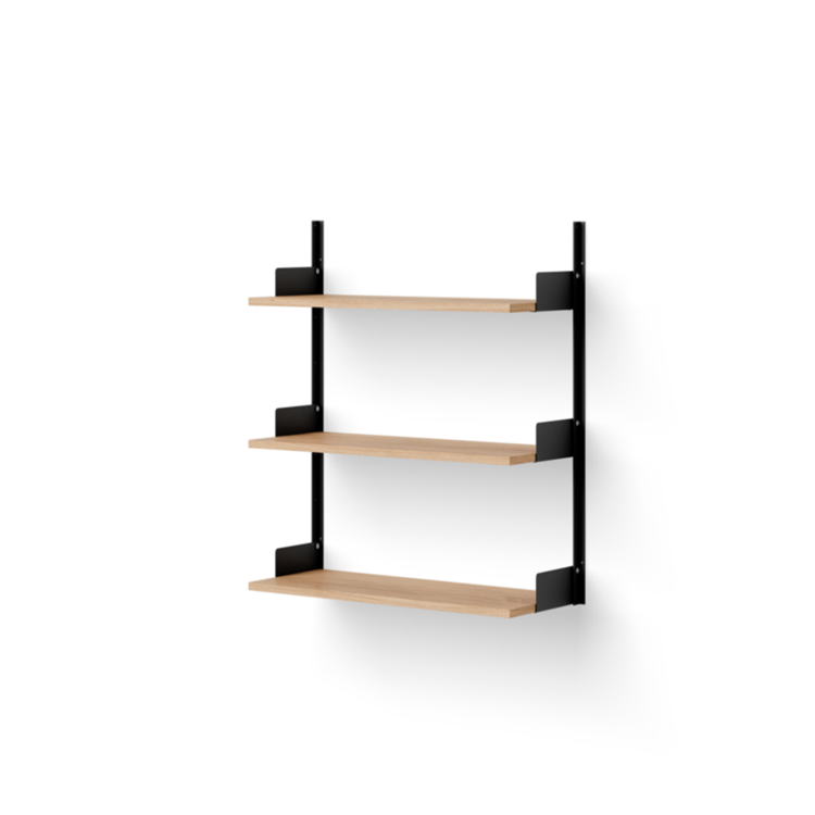 Shelves in oak veneer, support in aluminium and steel