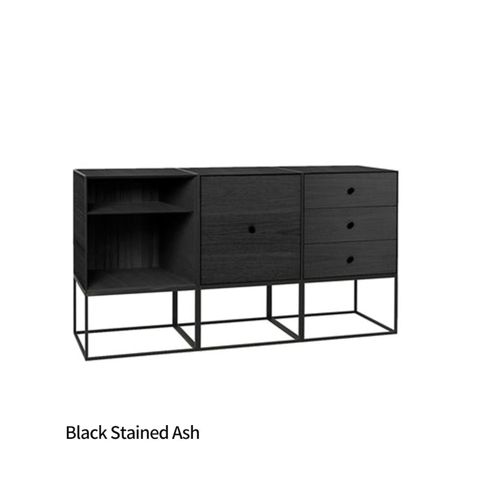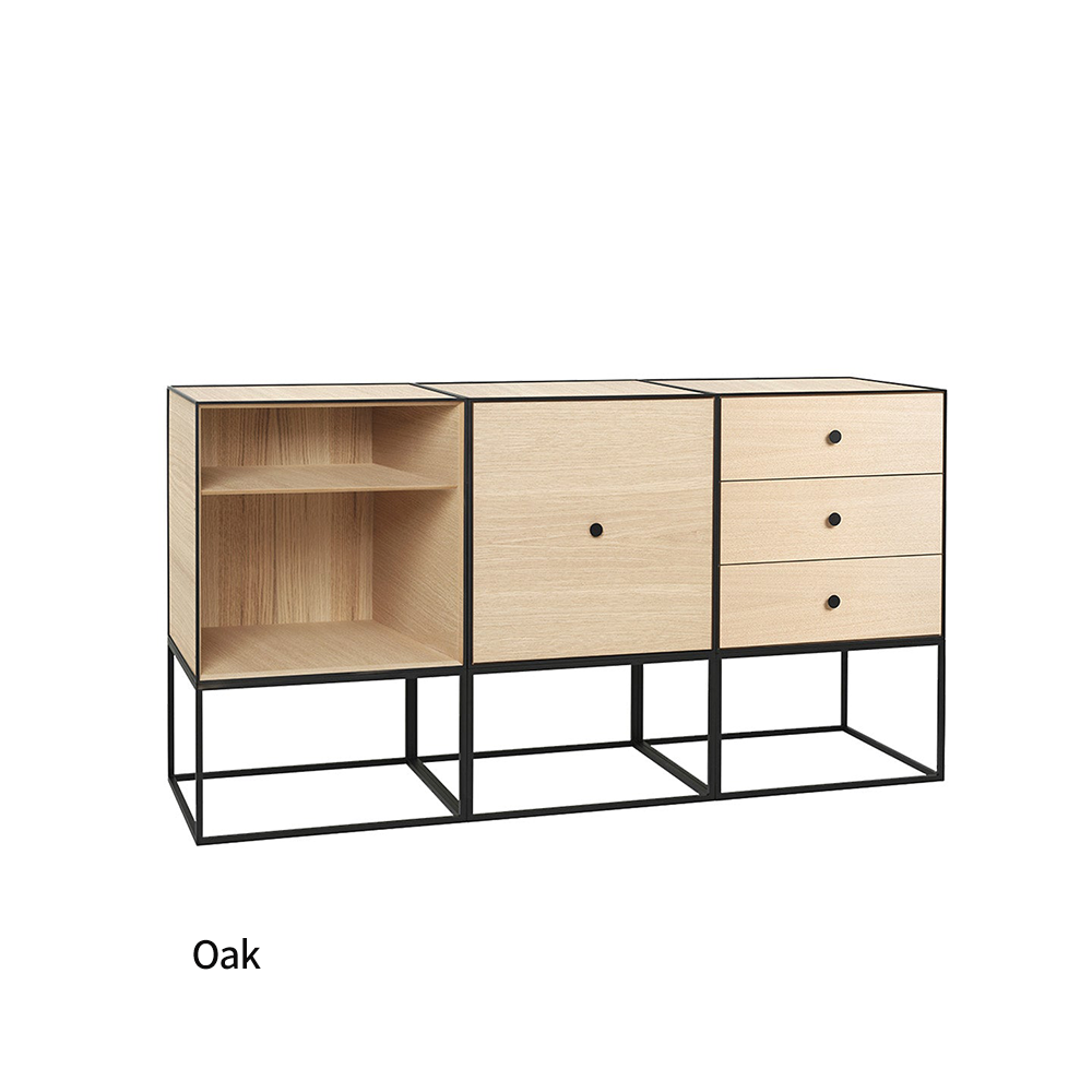 Frame은 선반, 서랍, 서랍 3개가 있는 세 개의 모듈로 구성된 유연한 보관 솔루션으로, 큐비스트 프레임에 장착되어 있습니다. 서랍에는 소프트 클로즈 시스템과 숨겨진 트랙이 있습니다.