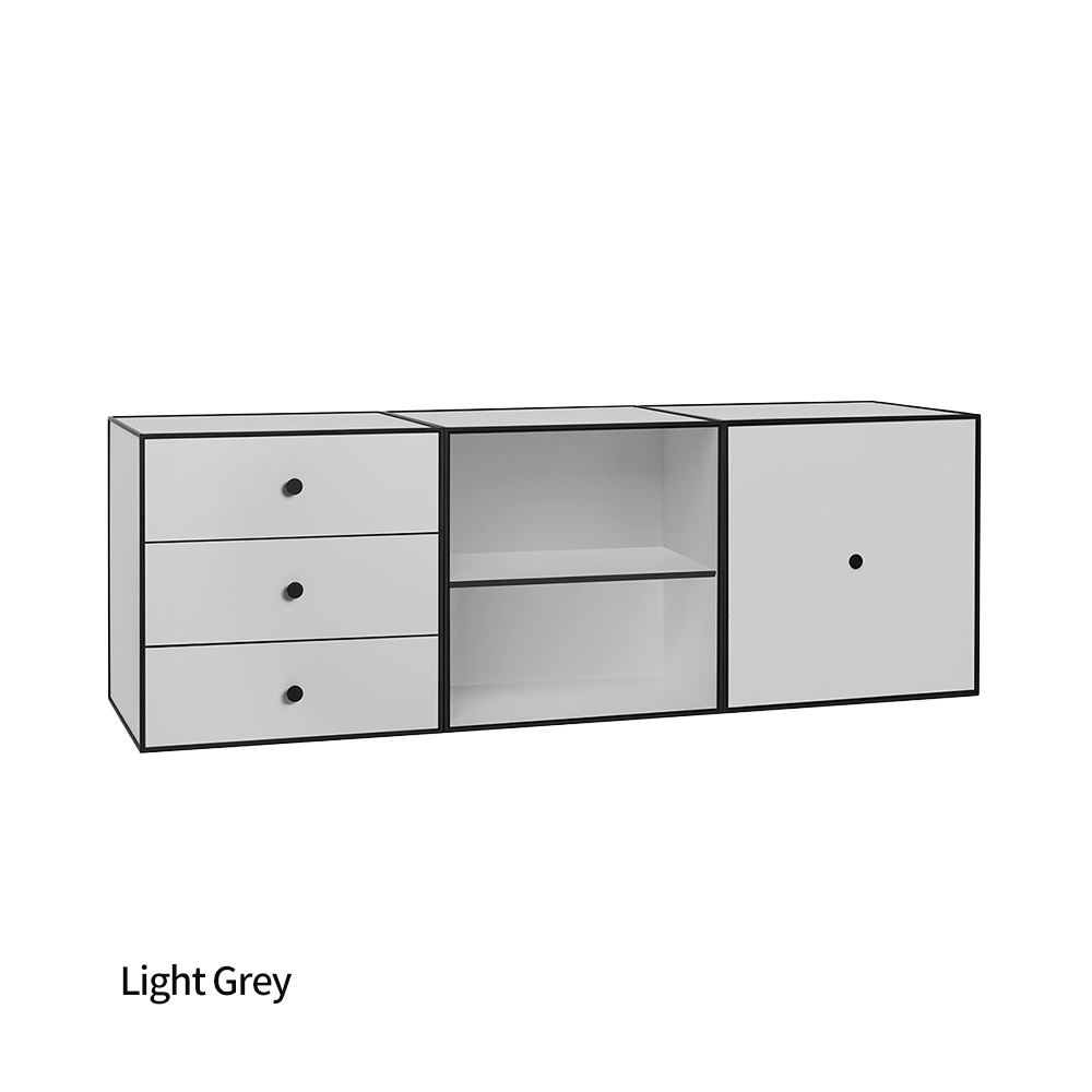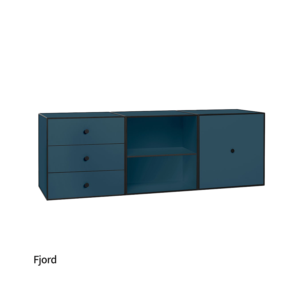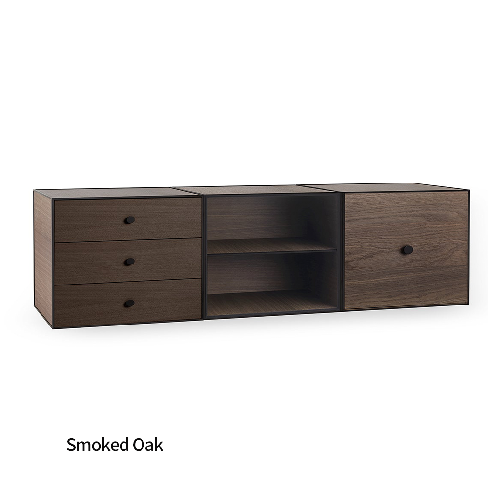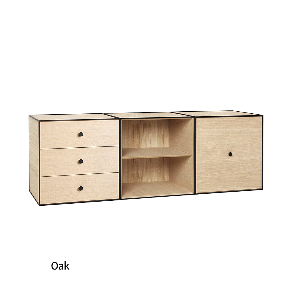 Frame은 선반, 서랍, 서랍 3개가 있는 세 개의 모듈로 구성된 유연한 보관 솔루션으로, 큐비스트 프레임에 장착되어 있습니다. 서랍에는 소프트 클로즈 시스템과 숨겨진 트랙이 있습니다.