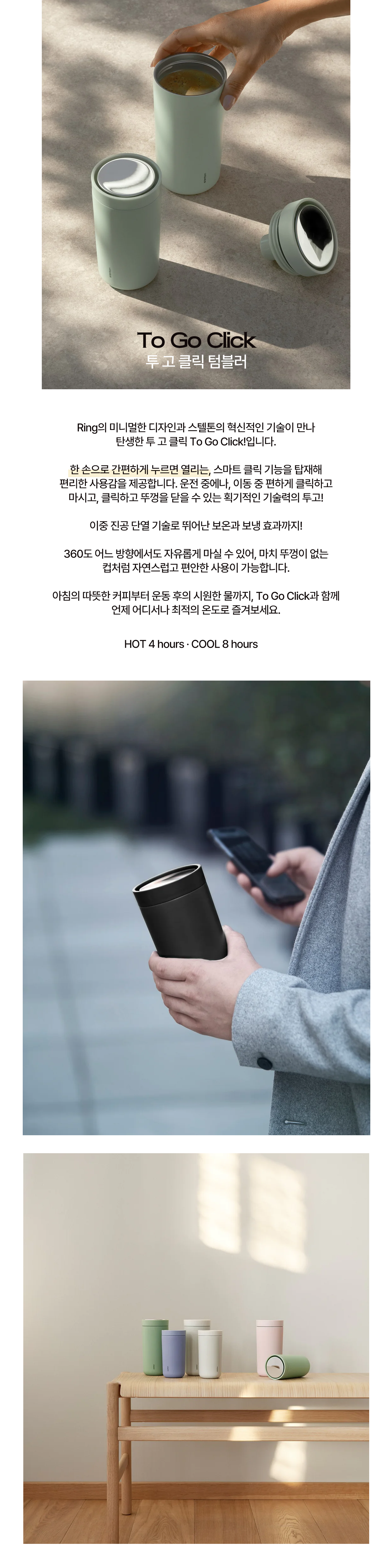 360도 어느 방향에서도 자유롭게 마실 수 있어, 마치 뚜껑이 없는 컵처럼 자연스럽고 편안한 사용이 가능합니다. 아침의 따뜻한 커피부터 운동 후의 시원한 물까지, To Go Click과 함께 언제 어디서나 최적의 온도로 즐겨보세요.
