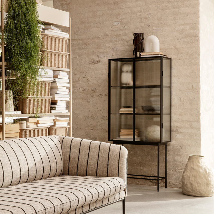 세련된 파우더 코팅 금속과 골판지 유리로 제작되었습니다. 금속과 유리의 소재 대조감이 멋진 작품입니다. 유리문은 자석 덕분에 매끄럽게 닫힙니다. 이 진열장을 사용하여 뷰티 필수품을 스타일리시하게 보관하거나 식기 등을 보관하세요