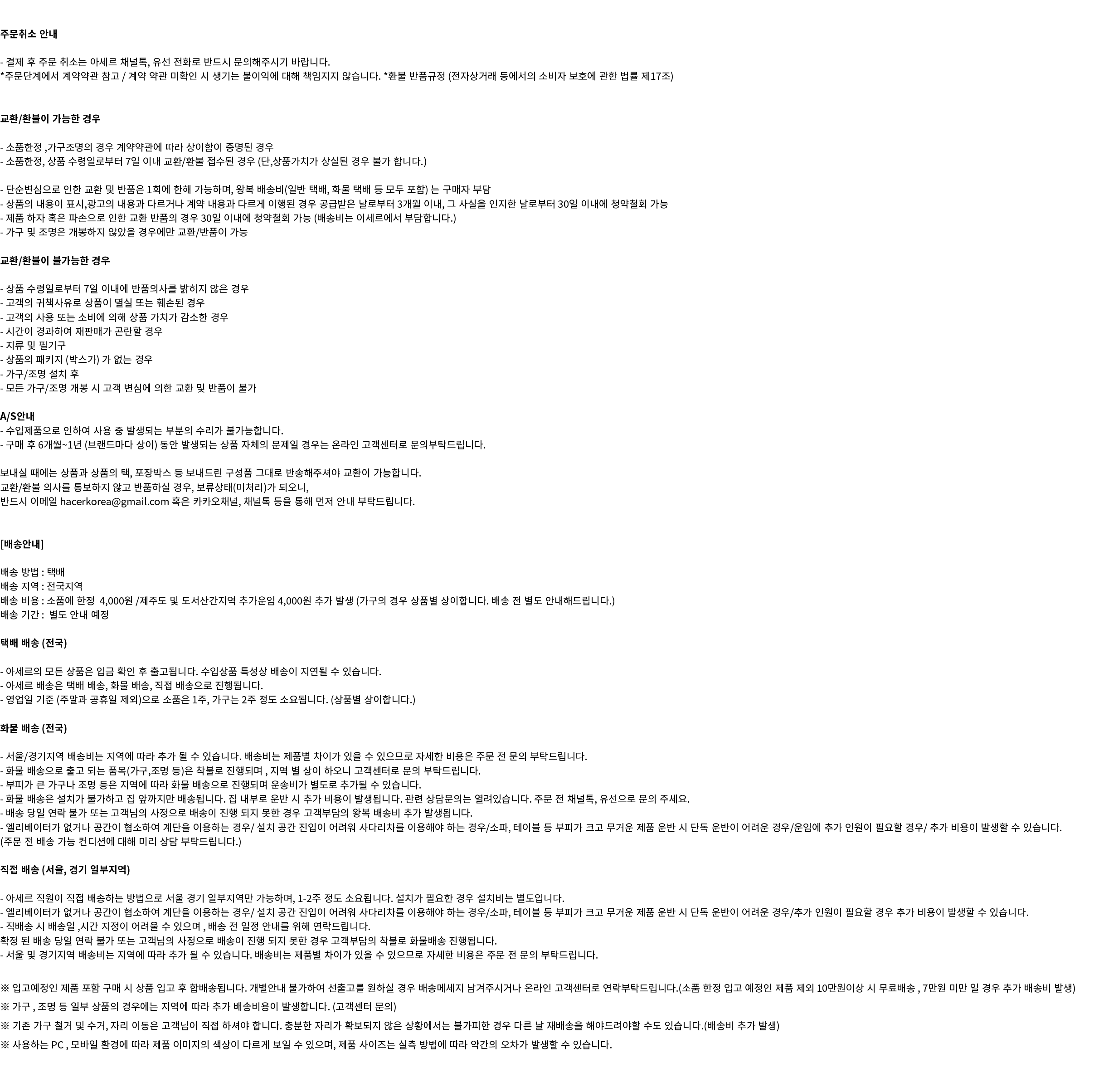 가구의 반품비용은 화물비용이 실비 청구되며, 자세한 사항은 아세르로 직접 문의바랍니다.
