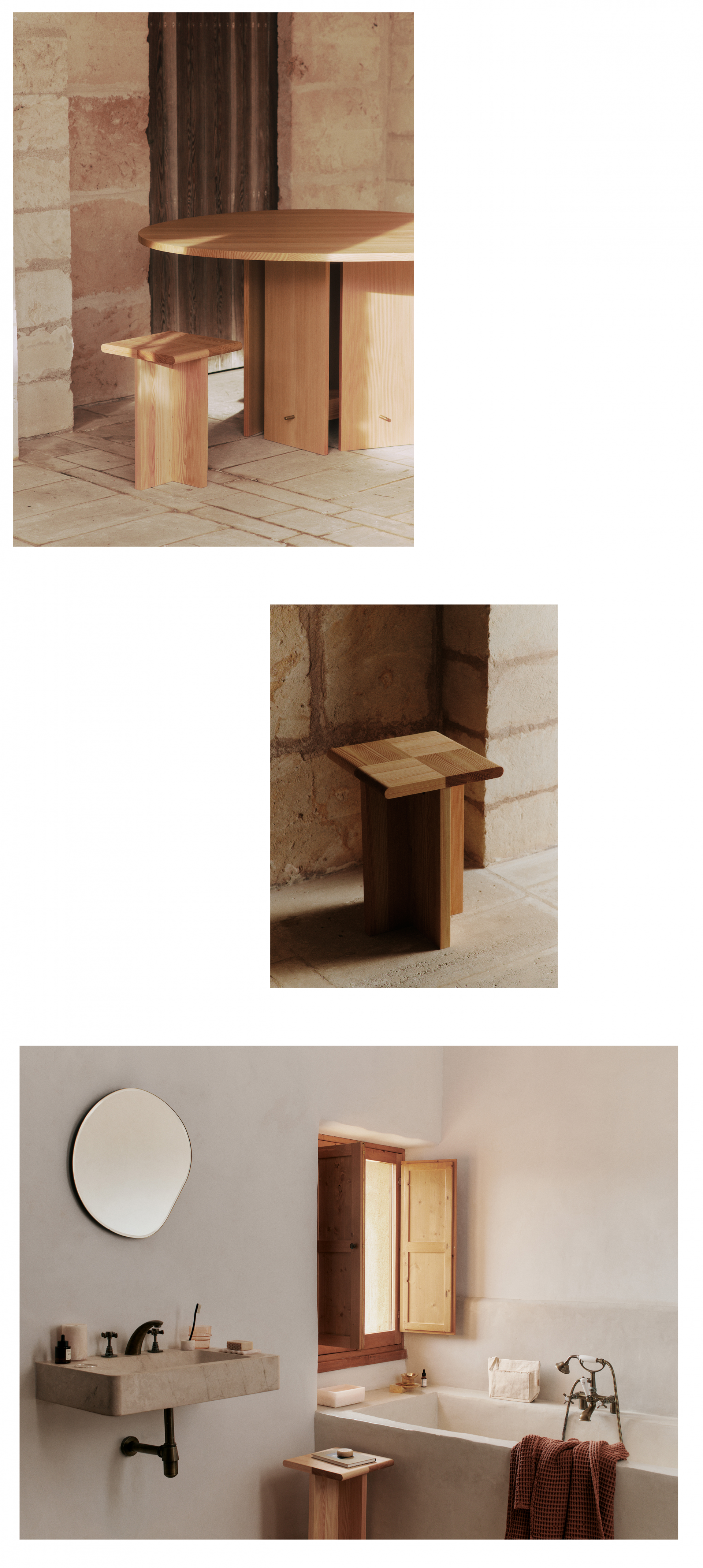 그중에서도 Sala Piece는 FSC™ 인증을 받은 더글러스 전나무로 제작되어, 천연 소재가 지닌 따스한 결을 고스란히 담아냅니다. 웃손이 Can Lis에서 직접 제작한 가구와 수작업 목공예에서 모티프를 얻은 이 작품은, 수공예적 정성과 시대를 초월한 디자인 감각이 절묘하게 맞닿아 있습니다.